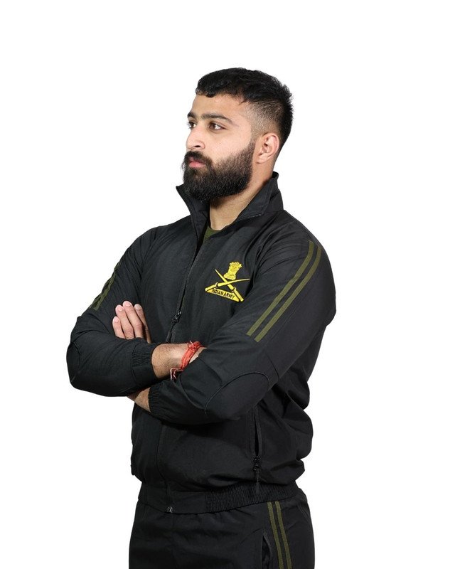 A sleek black tracksuit with Indian Army-inspired design, ideal for running, fitness routines, or everyday wear.